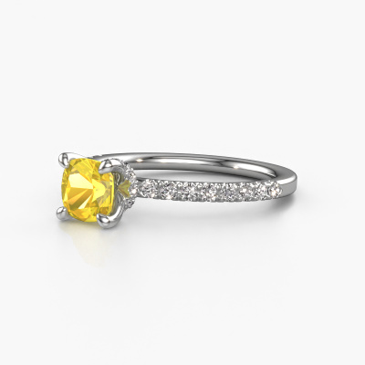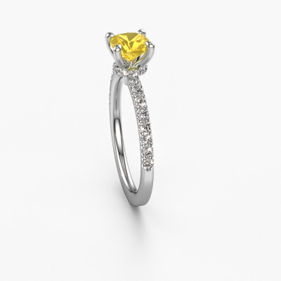 The ring shown above is called the Crystal CUS 4. We call this type of ring a pavé solitaire ring because it has one centre gemstone and a band that is also pave set with gemstones. The platinum engagement ring is set with a cushion 5.5 mm yellow sapphire centre stone and the band is pave set with diamond gemstones. Each jewel is created to add sparkle to your finger, each jewel is lovingly made by hand by our goldsmiths.This chic platinum pavé solitaire engagement ring has an exquisite cushion yellow sapphire centre stone. To further accentuate the centre stone, the band is fully set with more diamonds. Its open prong setting allows light to strike the yellow sapphire from various angles and this adds sparkle to your yellow sapphire ring. The photo shown above depicts the goldsmith's carefully handcrafted details of the ring. The high positioning of the centre stone is truly eye-catching. The perfect engagement ring for the crown jewel of your life! By using our modern techniques, we can design and customize the finest quality jewels with the utmost care for you. Our engagement rings are always priced 30 percent lower than other jewellers. We make engagement rings to order so we don't have to maintain a large stock. If you have a certain budget, we are more than happy to advice you accordingly.Do you have a specific ring in mind? One you came across somewhere. Please feel free to tell us your wishes and we will turn your design into a unique engagement ring. You can follow the development of your ring design because we use 3D drawings. This gives you a realistic preview of your design. We will gladly send you a non-binding offer, based on a fair price/ quality ratio. It will amaze you.To make it easier for you, we offer a 30 day return policy. Check our terms and conditions.