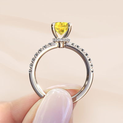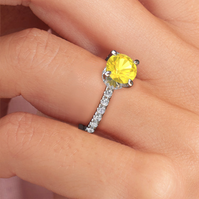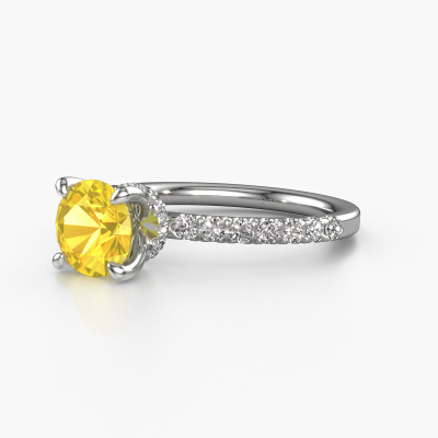 The ring shown above is called the Crystal rnd 4. We call this type of ring a pavé solitaire ring because it has one centre gemstone and a band that is also pave set with gemstones. The platinum engagement ring is set with a round 7 mm yellow sapphire centre stone and the band is pave set with lab grown diamond gemstones. Each jewel is made to shine bright around your finger. Each jewel is hand made with love by our goldsmiths.This fantasy platinum pavé solitaire engagement ring has an exquisite round yellow sapphire centre stone. To further accentuate the centre stone, the band is fully set with more lab-grown diamonds. Its open prong setting allows light to strike the yellow sapphire from various angles and this adds sparkle to your yellow sapphire ring. The photo shown above depicts the goldsmith's carefully handcrafted details of the ring. The high positioning of the centre stone is truly eye-catching. The perfect engagement ring for the crown jewel of your life! By using our modern techniques, we can design and customize the finest quality jewels with the utmost care for you. Our engagement rings are always priced 30 percent lower than other jewellers. We make engagement rings to order so we don't have to maintain a large stock. If you have a certain budget, we are more than happy to advice you accordingly.Have you found a specific engagement ring somewhere which you would like to give to your loved one? Please feel free to express your wishes to our jewel designers because we would be honoured to turn your design into a fantasy engagement ring. You can follow the development of your ring design because we use 3D drawings. This gives you a realistic preview of how your design will look. You can also preorder a dummy. A dummy is a plastic ring, which can be shaped according your ring design. You can try it on and check if its width and size are suitable for you. We will gladly send you a non-binding offer, based on a fair price/ quality ratio. It will amaze you, considering the quality of the ring and gemstones.To make it easier for you, we offer a 30 day return policy. Check our terms and conditions.
