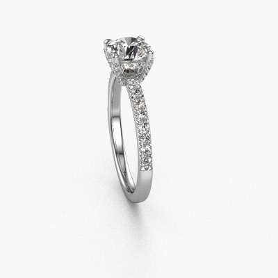 The ring shown above is called the Saskia rnd 1. We call this type of ring a pavé solitaire ring because it has one centre gemstone and a band that is also pave set with gemstones. The platinum engagement ring is set with a round 6.5 mm zirconia centre stone and the band is pave set with lab grown diamond gemstones. Each jewel is made with passion and love by one of our master goldsmiths.This exclusive platinum pavé solitaire engagement ring has an exquisite round zirconia centre stone. To further accentuate the centre stone, the band is fully set with more lab-grown diamonds. Its open prong setting allows light to strike the zirconia from various angles and this adds sparkle to your zirconia ring. The photo shown above depicts the goldsmith's carefully handcrafted details of the ring. The high positioning of the centre stone is truly eye-catching. The perfect engagement ring for the crown jewel of your life! By using a combination of the latest modern techniques, combined with ancient crafting, we can make all our engagement rings in our own studio. Each jewel is made to order. This is advantageous because we can offer you a price you won't find anywhere else.Do you have a specific ring in mind? One you came across somewhere. Please feel free to tell us your wishes and we will turn your design into a unique engagement ring. You can follow the development of your ring design because we use 3D drawings. This gives you a realistic preview of your design. We will gladly send you a non-binding offer, based on a fair price/ quality ratio. It will amaze you.To make it easier for you, we offer a 30 day return policy. Check our terms and conditions.