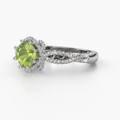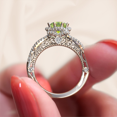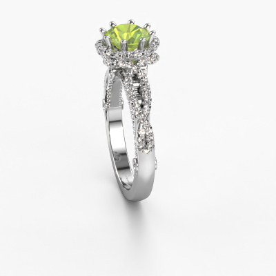 This platinum ring is called Lysanne and is set with 6.5 mm peridot. This filigree platinum engagement ring is a true work of art! A beautifully adorned design of intricate wires. With dedication, patience and the utmost precision, our expert goldsmith will design a ring just for you. The adornment of small wiring is crafted to perfection by hand. It's a lengthy process which includes welding, crafting and polishing until our Goldsmiths are completely satisfied with the result: a perfect eye-catching ring that makes her shine with delight. Therefore the vintage filigree engagement ring is an extraordinary gift to bestow upon the love of your life. A handmade one-of-a-kind personalized ring, to be given to that special someone on that special moment when you pop the question. Isn't that wonderful? This piece of jewellery is made by a team of passionate goldsmiths and jewel designers. This will make your crown jewel truly eye-catching.After receiving your order, our goldsmiths will start the creative process of making your Lysanne engagement ring. We don't keep stock. This is advantageous because these costs will not be passed on to you. Therefore, we can offer jewellery at exceptionally low prices.Have you found a specific engagement ring somewhere which you would like to give to your loved one? Please feel free to express your wishes to our jewel designers because we would be honoured to turn your design into a vintage engagement ring. You can follow the development of your ring design because we use 3D drawings. This gives you a realistic preview of how your design will look. You can also preorder a dummy. A dummy is a plastic ring, which can be shaped according your ring design. You can try it on and check if its width and size are suitable for you. We will gladly send you a non-binding offer, based on a fair price/ quality ratio. It will amaze you, considering the quality of the ring and gemstones.To make it easier for you, we offer a 30 day return policy. Check our terms and conditions.