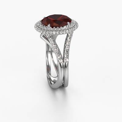 The ring shown above is called the Elvie. We call this type of ring a halo ring because it has one centre gemstone and a band that is also pave set with gemstones. The platinum engagement ring is set with a oval 10x8 mm garnet centre stone and the band is pave set with lab-grown diamonds. What makes this vintage platinum pavé solitaire ring special are the smaller sized stones embracing the centre stone. This gorgeous engagement ring is called a pavé solitaire ring because the smaller gemstones give the centre stone a pavé solitaire of surrounding light. In order for the smaller stones to enhance the centre stone, they have to be placed so there is no interference of light. And that's when our expert goldsmiths come in. Each individual stone is carefully set in the ring by hand. During manufacturing, light fall is constantly monitored to make sure the special pavé solitaire is still visible. In the end you get a unique engagement ring, with a garnet of your choosing at its centre. You can imagine the effect of a ring of such significance when you give it to her on her special day to shine. By using our modern techniques, we can design and customize the finest quality jewels with the utmost care for you. Our engagement rings are always priced 30 percent lower than other jewellers. We make engagement rings to order so we don't have to maintain a large stock. If you have a certain budget, we are more than happy to advice you accordingly.Do you have a specific ring in mind? One you came across somewhere. Please feel free to tell us your wishes and we will turn your design into a unique engagement ring. You can follow the development of your ring design because we use 3D drawings. This gives you a realistic preview of your design. We will gladly send you a non-binding offer, based on a fair price/ quality ratio. It will amaze you.To make it easier for you, we offer a 30 day return policy. Check our terms and conditions.