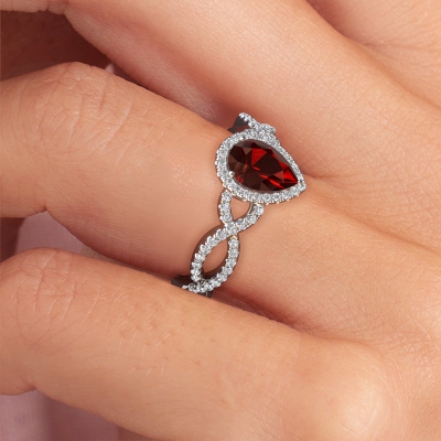 This platinum ring is called Dionne pear and is set with 7x5 mm garnet. Does your girlfriend fancy exclusive jewellery? Or would you like to show her that she deserves the finest jewellery? This platinum ring is pure craftsmanship, love and passion combined with the latest techniques coming together in perfect harmony. It requires a keen eye, patience and a skilful hand to mould this ring into perfection. Just the job for our expert goldsmith! The garnet set gemstones gives this platinum ring an extra glamorous appearance. Customize the style of the twist engagement ring to her liking with a wide variety of precious metals and gemstones which you select. That is how you create a unique ring for the most exclusive woman in your life! This jewel is created to add sparkle to your finger, each jewel is lovingly made by hand by our goldsmiths.Are you on a budget? Please feel free to contact us, so we can go discuss your options. We offer our engagement rings at guaranteed best price, because we make them to order. You won't find such a price anywhere else!Different styles of new rings are made daily by our team. Perhaps you have found a pavé solitaire engagement ring somewhere. One you would like to give to your loved one. Please feel free to share your thoughts and design with our jewel designers. We would love to turn your design into a exclusive engagement ring. You can follow the development of your ring design because we use very detailed 3D drawings. On top of that, you can order a dummy of the design. A dummy is a plastic ring, which can be shaped according your ring design. You can try it on and check if the engagement ring is up to standard. We will gladly send you a non-binding offer, based on a fair price/ quality ratio. The offer will baffle you, considering the quality of the ring and gemstones.To make it easier for you, we offer a 30 day return policy. Check our terms and conditions.