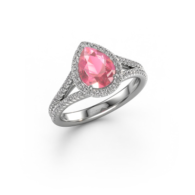 The ring shown above is called the Verla pear 2. We call this type of ring a halo ring because it has one centre gemstone and a band that is also pave set with gemstones. The platinum engagement ring is set with a pear 8x6 mm tourmaline pink centre stone and the band is pave set with diamonds. What makes this exclusive platinum halo ring special are the smaller sized stones embracing the centre stone. This gorgeous engagement ring is called a halo ring because the smaller gemstones give the centre stone a halo of surrounding light. In order for the smaller stones to enhance the centre stone, they have to be placed so there is no interference of light. And that's when our expert goldsmiths come in. Each individual stone is carefully set in the ring by hand. During manufacturing, light fall is constantly monitored to make sure the special halo is still visible. In the end you get a unique engagement ring, with a tourmaline pink of your choosing at its centre. You can imagine the effect of a ring of such significance when you give it to her on her special day to shine. After receiving your order, our goldsmiths will passionately start the creative process of making your engagement ring in our own studio. Because we don't have a big stockpile, these costs will not be passed on to you. Our pricing is proof of that! We offer top quality jewels at lowest price, guaranteed.Our designers and goldsmiths work together each day, creating new jewels. Perhaps you have found a nice exclusive engagement ring somewhere, which can be used to customize your unique ring. Please feel free to contact us. We will make you an offer, based on a fair price/ quality ratio, which will amaze you.To make it easier for you, we offer a 30 day return policy. Check our terms and conditions.