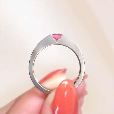 This platinum ring is called Arlena 2 and is set with 4 mm pink sapphire. This modern platinum Engagement ring is a true masterpiece! Our expert goldsmith uses special techniques during crafting of this tension set ring to make sure the pink sapphire of this platinum ring is fixed properly. The effect is that light fall reflects beautifully on the gemstone, which gives the ring its maximum shine and glamorous appearance. The result is a unique ring, with a trendy appearance, passionately handcrafted to perfection by our artisan goldsmith. A one-of-a-kind ring, designed for the love of your life! This jewel is unique in every way! Simply customize to your likingBy using our modern techniques, we can design and customize the finest quality jewels with the utmost care for you. Our Engagement rings are always priced 30 percent lower than other jewellers. We make Engagement rings to order so we don't have to maintain a large stock. If you have a certain budget, we are more than happy to advice you accordingly.Have you found a specific Engagement ring somewhere which you would like to give to your loved one? Please feel free to express your wishes to our jewel designers because we would be honoured to turn your design into a modern Engagement ring. You can follow the development of your ring design because we use 3D drawings. This gives you a realistic preview of how your design will look. You can also preorder a dummy. A dummy is a plastic ring, which can be shaped according your ring design. You can try it on and check if its width and size are suitable for you. We will gladly send you a non-binding offer, based on a fair price/ quality ratio. It will amaze you, considering the quality of the ring and gemstones.To make it easier for you, we offer a 30 day return policy. Check our terms and conditions.
