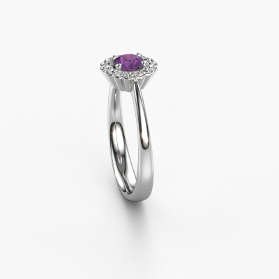 The ring shown above is called the Debi. We call this type of ring a halo ring because it has one centre gemstone and a band that is also pave set with gemstones. The platinum engagement ring is set with a round 4.2 mm amethyst centre stone and the band is pave set with diamonds. What makes this classic platinum halo ring special are the smaller sized stones embracing the centre stone. This gorgeous engagement ring is called a halo ring because the smaller gemstones give the centre stone a halo of surrounding light. In order for the smaller stones to enhance the centre stone, they have to be placed so there is no interference of light. And that's when our expert goldsmiths come in. Each individual stone is carefully set in the ring by hand. During manufacturing, light fall is constantly monitored to make sure the special halo is still visible. In the end you get a unique engagement ring, with a amethyst of your choosing at its centre. You can imagine the effect of a ring of such significance when you give it to her on her special day to shine. Because we design and deliver our own rings, we can offer you a engagement ring at a price you won't find anywhere else. A ring is made to order, which helps prevent excess supplies, so we can make you a great price offer. We understand it feels risky, buying your engagement ring online, but we will gladly assist in the designing process, taking your budget into consideration.Our team adds new designs to our online collection daily. Our designers and goldsmiths work together in creating the best design. We strive to offer a diverse collection of jewels. Perhaps you have a specific jewel design in mind. One you came across somewhere. Please contact us for a free consultation. We will make you an offer, based on a fair price/ quality ratio, that will baffle you.To make it easier for you, we offer a 30 day return policy. Check our terms and conditions.