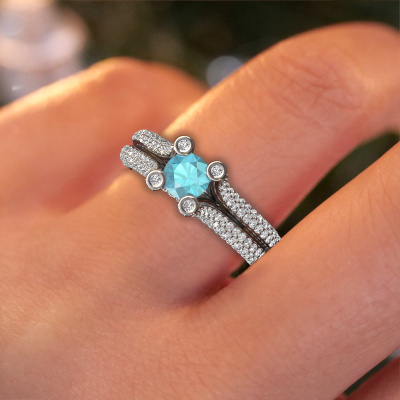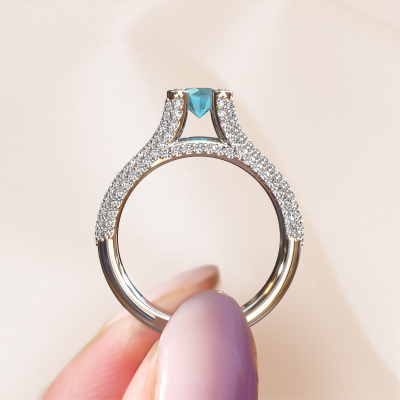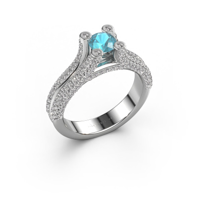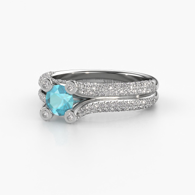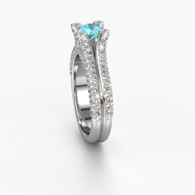 This platinum ring is called Stefanie 2 and is set with 5 mm blue topaz. Does your girlfriend fancy exclusive jewellery? Or would you like to show her that she deserves the finest jewellery? This platinum ring is pure craftsmanship, love and passion combined with the latest techniques coming together in perfect harmony. It requires a keen eye, patience and a skilful hand to mould this ring into perfection. Just the job for our expert goldsmith! The blue topaz set gemstones gives this platinum ring an extra glamorous appearance. Customize the style of the split band engagement ring to her liking with a wide variety of precious metals and gemstones which you select. That is how you create a unique ring for the most exclusive woman in your life! This jewel is made just for you by our master goldsmiths in our own studio.After receiving your order, our goldsmiths will passionately start the creative process of making your engagement ring in our own studio. Because we don't have a big stockpile, these costs will not be passed on to you. Our pricing is proof of that! We offer top quality jewels at lowest price, guaranteed.Different styles of new rings are made daily by our team. Perhaps you have found a pavé solitaire engagement ring somewhere. One you would like to give to your loved one. Please feel free to share your thoughts and design with our jewel designers. We would love to turn your design into a unique engagement ring. You can follow the development of your ring design because we use very detailed 3D drawings. On top of that, you can order a dummy of the design. A dummy is a plastic ring, which can be shaped according your ring design. You can try it on and check if the engagement ring is up to standard. We will gladly send you a non-binding offer, based on a fair price/ quality ratio. The offer will baffle you, considering the quality of the ring and gemstones.To make it easier for you, we offer a 30 day return policy. Check our terms and conditions.
