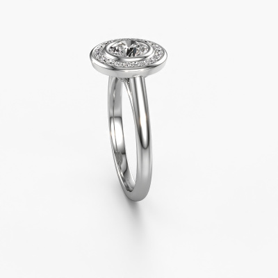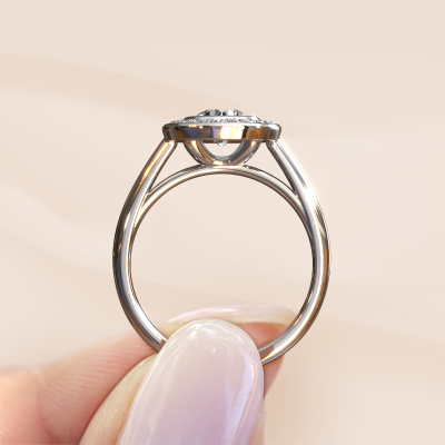 The ring shown above is called the Noud 1 RND. We call this type of ring a halo ring because it has one centre gemstone and a band that is also pave set with gemstones. The platinum promise ring is set with a round 0.60 crt diamond centre stone and the band is pave set with diamonds. What makes this traditional platinum halo ring special are the smaller sized stones embracing the centre stone. This gorgeous promise ring is called a halo ring because the smaller gemstones give the centre stone a halo of surrounding light. In order for the smaller stones to enhance the centre stone, they have to be placed so there is no interference of light. And that's when our expert goldsmiths come in. Each individual stone is carefully set in the ring by hand. During manufacturing, light fall is constantly monitored to make sure the special halo is still visible. In the end you get a unique promise ring, with a diamond of your choosing at its centre. You can imagine the effect of a ring of such significance when you give it to her on her special day to shine. By using a combination of the latest modern techniques, combined with ancient crafting, we can make all our promise ring in our own studio. Each jewel is made to order. This is advantageous because we can offer you a price you won't find anywhere else.Do you have a specific ring in mind? One you came across somewhere. Please feel free to tell us your wishes and we will turn your design into a unique promise ring. You can follow the development of your ring design because we use 3D drawings. This gives you a realistic preview of your design. We will gladly send you a non-binding offer, based on a fair price/ quality ratio. It will amaze you.To make it easier for you, we offer a 30 day return policy. Check our terms and conditions.
