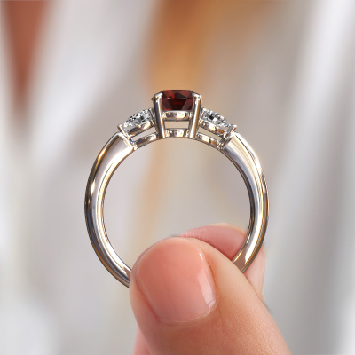 This platinum ring is called Chanou RND and is set with 6 mm garnet. Does your girlfriend fancy exclusive jewellery? Or would you like to show her that she deserves the finest jewellery? This platinum ring is pure craftsmanship, love and passion combined with the latest techniques coming together in perfect harmony. It requires a keen eye, patience and a skilful hand to mould this ring into perfection. Just the job for our expert goldsmith! The garnet set gemstones gives this platinum ring an extra glamorous appearance. Customize the style of the charming engagement ring to her liking with a wide variety of precious metals and gemstones which you select. That is how you create a unique ring for the most exclusive woman in your life! This jewel is made to shine bright around your finger. Each jewel is hand made with love by our goldsmiths.By using a combination of the latest modern techniques, combined with ancient crafting, we can make all our engagement rings in our own studio. Each jewel is made to order. This is advantageous because we can offer you a price you won't find anywhere else.Our team adds new designs to our online collection daily. Our designers and goldsmiths work together in creating the best design. We strive to offer a diverse collection of jewels. Perhaps you have a specific jewel design in mind. One you came across somewhere. Please contact us for a free consultation. We will make you an offer, based on a fair price/ quality ratio, that will baffle you.To make it easier for you, we offer a 30 day return policy. Check our terms and conditions.