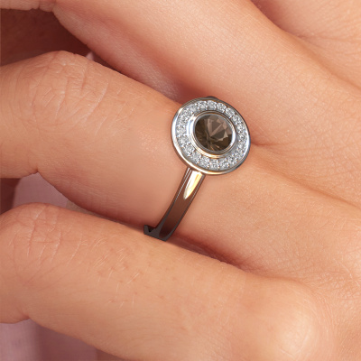 The ring shown above is called the Noud 1 RND. We call this type of ring a halo ring because it has one centre gemstone and a band that is also pave set with gemstones. The platinum promise ring is set with a round 4.7 mm smokey quartz centre stone and the band is pave set with diamonds. What makes this traditional platinum halo ring special are the smaller sized stones embracing the centre stone. This gorgeous promise ring is called a halo ring because the smaller gemstones give the centre stone a halo of surrounding light. In order for the smaller stones to enhance the centre stone, they have to be placed so there is no interference of light. And that's when our expert goldsmiths come in. Each individual stone is carefully set in the ring by hand. During manufacturing, light fall is constantly monitored to make sure the special halo is still visible. In the end you get a unique promise ring, with a smokey quartz of your choosing at its centre. You can imagine the effect of a ring of such significance when you give it to her on her special day to shine. By using a combination of the latest modern techniques, combined with ancient crafting, we can make all our promise ring in our own studio. Each jewel is made to order. This is advantageous because we can offer you a price you won't find anywhere else.Do you have a specific ring in mind? One you came across somewhere. Please feel free to tell us your wishes and we will turn your design into a unique promise ring. You can follow the development of your ring design because we use 3D drawings. This gives you a realistic preview of your design. We will gladly send you a non-binding offer, based on a fair price/ quality ratio. It will amaze you.To make it easier for you, we offer a 30 day return policy. Check our terms and conditions.