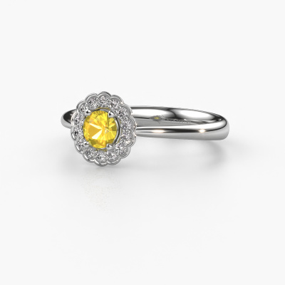 The ring shown above is called the Debi. We call this type of ring a halo ring because it has one centre gemstone and a band that is also pave set with gemstones. The platinum engagement ring is set with a round 4.2 mm yellow sapphire centre stone and the band is pave set with diamonds. What makes this classic platinum halo ring special are the smaller sized stones embracing the centre stone. This gorgeous engagement ring is called a halo ring because the smaller gemstones give the centre stone a halo of surrounding light. In order for the smaller stones to enhance the centre stone, they have to be placed so there is no interference of light. And that's when our expert goldsmiths come in. Each individual stone is carefully set in the ring by hand. During manufacturing, light fall is constantly monitored to make sure the special halo is still visible. In the end you get a unique engagement ring, with a yellow sapphire of your choosing at its centre. You can imagine the effect of a ring of such significance when you give it to her on her special day to shine. Because we design and deliver our own rings, we can offer you a engagement ring at a price you won't find anywhere else. A ring is made to order, which helps prevent excess supplies, so we can make you a great price offer. We understand it feels risky, buying your engagement ring online, but we will gladly assist in the designing process, taking your budget into consideration.Our team adds new designs to our online collection daily. Our designers and goldsmiths work together in creating the best design. We strive to offer a diverse collection of jewels. Perhaps you have a specific jewel design in mind. One you came across somewhere. Please contact us for a free consultation. We will make you an offer, based on a fair price/ quality ratio, that will baffle you.To make it easier for you, we offer a 30 day return policy. Check our terms and conditions.