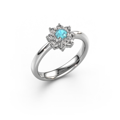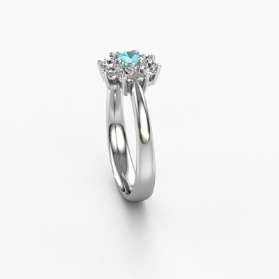 The ring shown above is called the Camille 1. We call this type of ring a cluster ring, the centre gemstone is surrounded by smaller sized stones. This platinum version is set with a 3.4 mm round blue topaz centre stone, embraced by smaller diamonds. The traditional platinum cluster engagement ring stands out because of its shape. Together, the smaller and bigger sized blue topaz gemstones form a flower and they appear to collide into one big sparkling gem. This traditional engagement ring is also known as the flower ring. Our expert Goldsmiths make sure the smaller diamonds stones are set identically so there is no light interference in the blue topaz but unity instead. With perfect precision and a skilful hand each blue topaz is set in the ring. During manufacturing, it is constantly monitored to make sure light reflects flawlessly. This results in a unique engagement ring, with a radiant blue topaz at its centre. A lovely, meaningful gift to bestow upon the love of your life. By using our modern techniques, we can design and customize the finest quality jewels with the utmost care for you. Our engagement rings are always priced 30 percent lower than other jewellers. We make engagement rings to order so we don't have to maintain a large stock. If you have a certain budget, we are more than happy to advice you accordingly.Our team adds new designs to our online collection daily. Our designers and goldsmiths work together in creating the best design. We strive to offer a diverse collection of jewels. Perhaps you have a specific jewel design in mind. One you came across somewhere. Please contact us for a free consultation. We will make you an offer, based on a fair price/ quality ratio, that will baffle you.To make it easier for you, we offer a 30 day return policy. Check our terms and conditions.
