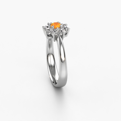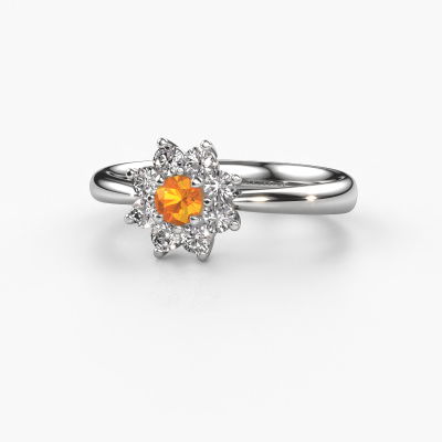 The ring shown above is called the Camille 1. We call this type of ring a cluster ring, the centre gemstone is surrounded by smaller sized stones. This platinum version is set with a 3.4 mm round citrin centre stone, embraced by smaller diamonds. The traditional platinum cluster engagement ring stands out because of its shape. Together, the smaller and bigger sized citrin gemstones form a flower and they appear to collide into one big sparkling gem. This traditional engagement ring is also known as the flower ring. Our expert Goldsmiths make sure the smaller diamonds stones are set identically so there is no light interference in the citrin but unity instead. With perfect precision and a skilful hand each citrin is set in the ring. During manufacturing, it is constantly monitored to make sure light reflects flawlessly. This results in a unique engagement ring, with a radiant citrin at its centre. A lovely, meaningful gift to bestow upon the love of your life. By using our modern techniques, we can design and customize the finest quality jewels with the utmost care for you. Our engagement rings are always priced 30 percent lower than other jewellers. We make engagement rings to order so we don't have to maintain a large stock. If you have a certain budget, we are more than happy to advice you accordingly.Our team adds new designs to our online collection daily. Our designers and goldsmiths work together in creating the best design. We strive to offer a diverse collection of jewels. Perhaps you have a specific jewel design in mind. One you came across somewhere. Please contact us for a free consultation. We will make you an offer, based on a fair price/ quality ratio, that will baffle you.To make it easier for you, we offer a 30 day return policy. Check our terms and conditions.
