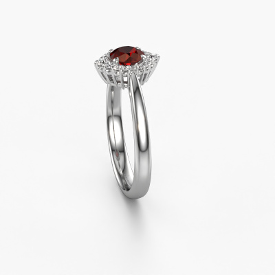 The ring shown above is called the Tora. We call this type of ring a cluster ring, the centre gemstone is surrounded by smaller sized stones. This platinum version is set with a 5 mm round garnet centre stone, embraced by smaller lab-grown diamonds. The classic platinum cluster engagement ring stands out because of its shape. Together, the smaller and bigger sized garnet gemstones form a flower and they appear to collide into one big sparkling gem. This classic engagement ring is also known as the flower ring. Our expert Goldsmiths make sure the smaller lab-grown diamonds stones are set identically so there is no light interference in the garnet but unity instead. With perfect precision and a skilful hand each garnet is set in the ring. During manufacturing, it is constantly monitored to make sure light reflects flawlessly. This results in a unique engagement ring, with a radiant garnet at its centre. A lovely, meaningful gift to bestow upon the love of your life. By using a combination of the latest modern techniques, combined with ancient crafting, we can make all our engagement rings in our own studio. Each jewel is made to order. This is advantageous because we can offer you a price you won't find anywhere else.Have you found a specific engagement ring somewhere which you would like to give to your loved one? Please feel free to express your wishes to our jewel designers because we would be honoured to turn your design into a classic engagement ring. You can follow the development of your ring design because we use 3D drawings. This gives you a realistic preview of how your design will look. You can also preorder a dummy. A dummy is a plastic ring, which can be shaped according your ring design. You can try it on and check if its width and size are suitable for you. We will gladly send you a non-binding offer, based on a fair price/ quality ratio. It will amaze you, considering the quality of the ring and gemstones.To make it easier for you, we offer a 30 day return policy. Check our terms and conditions.