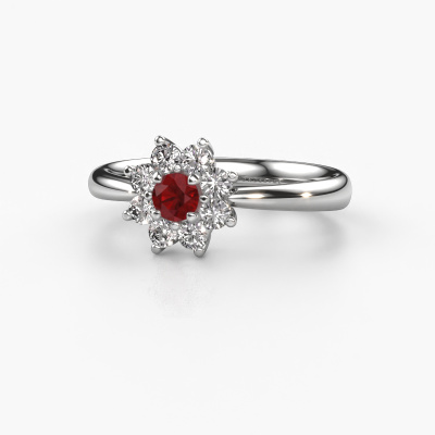 The ring shown above is called the Camille 1. We call this type of ring a cluster ring, the centre gemstone is surrounded by smaller sized stones. This platinum version is set with a 3.4 mm round ruby centre stone, embraced by smaller diamonds. The traditional platinum cluster engagement ring stands out because of its shape. Together, the smaller and bigger sized ruby gemstones form a flower and they appear to collide into one big sparkling gem. This traditional engagement ring is also known as the flower ring. Our expert Goldsmiths make sure the smaller diamonds stones are set identically so there is no light interference in the ruby but unity instead. With perfect precision and a skilful hand each ruby is set in the ring. During manufacturing, it is constantly monitored to make sure light reflects flawlessly. This results in a unique engagement ring, with a radiant ruby at its centre. A lovely, meaningful gift to bestow upon the love of your life. By using our modern techniques, we can design and customize the finest quality jewels with the utmost care for you. Our engagement rings are always priced 30 percent lower than other jewellers. We make engagement rings to order so we don't have to maintain a large stock. If you have a certain budget, we are more than happy to advice you accordingly.Our team adds new designs to our online collection daily. Our designers and goldsmiths work together in creating the best design. We strive to offer a diverse collection of jewels. Perhaps you have a specific jewel design in mind. One you came across somewhere. Please contact us for a free consultation. We will make you an offer, based on a fair price/ quality ratio, that will baffle you.To make it easier for you, we offer a 30 day return policy. Check our terms and conditions.