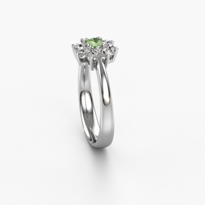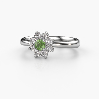 The ring shown above is called the Camille 1. We call this type of ring a cluster ring, the centre gemstone is surrounded by smaller sized stones. This platinum version is set with a 3.4 mm round tourmaline green centre stone, embraced by smaller diamonds. The traditional platinum cluster engagement ring stands out because of its shape. Together, the smaller and bigger sized tourmaline green gemstones form a flower and they appear to collide into one big sparkling gem. This traditional engagement ring is also known as the flower ring. Our expert Goldsmiths make sure the smaller diamonds stones are set identically so there is no light interference in the tourmaline green but unity instead. With perfect precision and a skilful hand each tourmaline green is set in the ring. During manufacturing, it is constantly monitored to make sure light reflects flawlessly. This results in a unique engagement ring, with a radiant tourmaline green at its centre. A lovely, meaningful gift to bestow upon the love of your life. By using our modern techniques, we can design and customize the finest quality jewels with the utmost care for you. Our engagement rings are always priced 30 percent lower than other jewellers. We make engagement rings to order so we don't have to maintain a large stock. If you have a certain budget, we are more than happy to advice you accordingly.Our team adds new designs to our online collection daily. Our designers and goldsmiths work together in creating the best design. We strive to offer a diverse collection of jewels. Perhaps you have a specific jewel design in mind. One you came across somewhere. Please contact us for a free consultation. We will make you an offer, based on a fair price/ quality ratio, that will baffle you.To make it easier for you, we offer a 30 day return policy. Check our terms and conditions.