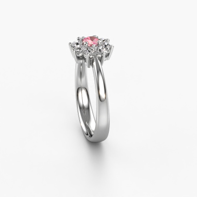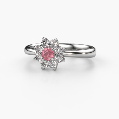 The ring shown above is called the Camille 1. We call this type of ring a cluster ring, the centre gemstone is surrounded by smaller sized stones. This platinum version is set with a 3.4 mm round tourmaline pink centre stone, embraced by smaller diamonds. The traditional platinum cluster engagement ring stands out because of its shape. Together, the smaller and bigger sized tourmaline pink gemstones form a flower and they appear to collide into one big sparkling gem. This traditional engagement ring is also known as the flower ring. Our expert Goldsmiths make sure the smaller diamonds stones are set identically so there is no light interference in the tourmaline pink but unity instead. With perfect precision and a skilful hand each tourmaline pink is set in the ring. During manufacturing, it is constantly monitored to make sure light reflects flawlessly. This results in a unique engagement ring, with a radiant tourmaline pink at its centre. A lovely, meaningful gift to bestow upon the love of your life. By using our modern techniques, we can design and customize the finest quality jewels with the utmost care for you. Our engagement rings are always priced 30 percent lower than other jewellers. We make engagement rings to order so we don't have to maintain a large stock. If you have a certain budget, we are more than happy to advice you accordingly.Our team adds new designs to our online collection daily. Our designers and goldsmiths work together in creating the best design. We strive to offer a diverse collection of jewels. Perhaps you have a specific jewel design in mind. One you came across somewhere. Please contact us for a free consultation. We will make you an offer, based on a fair price/ quality ratio, that will baffle you.To make it easier for you, we offer a 30 day return policy. Check our terms and conditions.