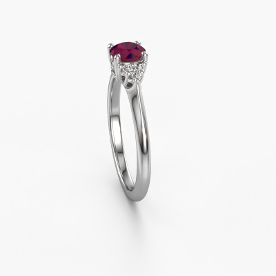 This platinum ring is called Felipa RND and is set with 5 mm rhodolite. What is it that makes your relationship unique? What is it about her that makes you want to bend down on one knee? The unique bond between the two of you is emphasized by an equally unique ring. A one of a kind ajour 3-stone engagement ring made especially for her. That is why this fantasy ring fits her like a glove. Each specific detail of this ajour platinum rhodolite set engagement ring is hand-picked, crafted and polished by our expert goldsmith. The result is an exquisite ring, unique and perfectly crafted to perfection. That is what our expert Goldsmiths strive for. This jewel is made just for you by our master goldsmiths in our own studio.After receiving your order, our goldsmiths will passionately start the creative process of making your engagement ring in our own studio. Because we don't have a big stockpile, these costs will not be passed on to you. Our pricing is proof of that! We offer top quality jewels at lowest price, guaranteed.Have you found a specific engagement ring somewhere which you would like to give to your loved one? Please feel free to express your wishes to our jewel designers because we would be honoured to turn your design into a fantasy engagement ring. You can follow the development of your ring design because we use 3D drawings. This gives you a realistic preview of how your design will look. You can also preorder a dummy. A dummy is a plastic ring, which can be shaped according your ring design. You can try it on and check if its width and size are suitable for you. We will gladly send you a non-binding offer, based on a fair price/ quality ratio. It will amaze you, considering the quality of the ring and gemstones.To make it easier for you, we offer a 30 day return policy. Check our terms and conditions.