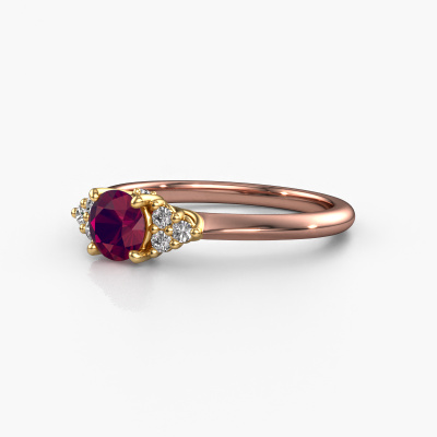 This 14 Carat rose gold ring is called Felipa RND and is set with 5 mm rhodolite. What is it that makes your relationship unique? What is it about her that makes you want to bend down on one knee? The unique bond between the two of you is emphasized by an equally unique ring. A one of a kind ajour 3-stone engagement ring made especially for her. That is why this fantasy ring fits her like a glove. Each specific detail of this ajour rose gold rhodolite set engagement ring is hand-picked, crafted and polished by our expert goldsmith. The result is an exquisite ring, unique and perfectly crafted to perfection. That is what our expert Goldsmiths strive for. This jewel is made just for you by our master goldsmiths in our own studio.After receiving your order, our goldsmiths will passionately start the creative process of making your engagement ring in our own studio. Because we don't have a big stockpile, these costs will not be passed on to you. Our pricing is proof of that! We offer top quality jewels at lowest price, guaranteed.Have you found a specific engagement ring somewhere which you would like to give to your loved one? Please feel free to express your wishes to our jewel designers because we would be honoured to turn your design into a fantasy engagement ring. You can follow the development of your ring design because we use 3D drawings. This gives you a realistic preview of how your design will look. You can also preorder a dummy. A dummy is a plastic ring, which can be shaped according your ring design. You can try it on and check if its width and size are suitable for you. We will gladly send you a non-binding offer, based on a fair price/ quality ratio. It will amaze you, considering the quality of the ring and gemstones.To make it easier for you, we offer a 30 day return policy. Check our terms and conditions.