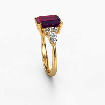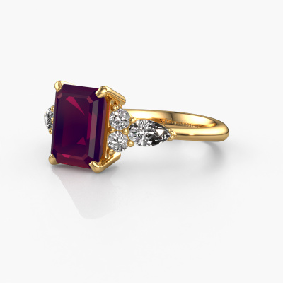 This 14 Carat gold ring is called Melani EME and is set with rhodolite. How would you describe the style of the love of your life? Does she have a unique sense of style? This stunning sublime gold promise ring can be custom-made to your own or her liking. Our rhodolite gemstones have been carefully selected because we believe your contemporary promise ring must be adorned with nothing but the most beautiful gemstone. Don't you agree? This jewel is made just for you, with attention to detail and design.Are you on a budget? Please feel free to contact us, so we can go discuss your options. We offer our promise ring at guaranteed best price, because we make them to order. You won't find such a price anywhere else!Do you have a specific ring in mind? One you came across somewhere. Please feel free to tell us your wishes and we will turn your design into a unique promise ring. You can follow the development of your ring design because we use 3D drawings. This gives you a realistic preview of your design. We will gladly send you a non-binding offer, based on a fair price/ quality ratio. It will amaze you.To make it easier for you, we offer a 30 day return policy. Check our terms and conditions.