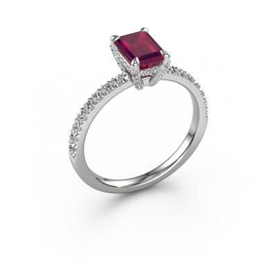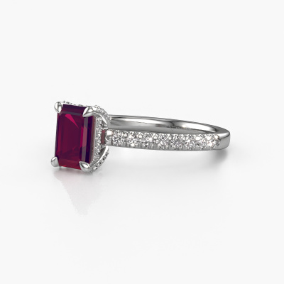 The ring shown above is called the Saskia eme 1, we call this a solitaire ring because it contains a single gemstone. The engagement ring is made in platinum and has a emerald cut rhodolite of 7x5 mm. The cool thing about our configurator is that you can compile your own piece of jewellery, into a completely personalized one. This solitaire ring is crafted in the precious metals platinum with platinum, but of course you are free to pick your own colours. Each piece of jewellery is made with passion and love by one of our master goldsmiths.The solitaire ring is a special type of engagement ring. Its open prong setting allows light to strike the gemstone from various angles. This exclusive engagement ring is a stunning eye-catcher because of the high positioning of the gemstone. In order for you to commemorate your proposal with a unique ring, we carefully adorn this solitaire ring by hand. The love of your life deserves nothing but the best. After receiving your order, our goldsmiths will passionately start the creative process of making your engagement ring in our own studio. Because we don't have a big stockpile, these costs will not be passed on to you. Our pricing is proof of that! We offer top quality jewels at lowest price, guaranteed.Our team adds new designs to our online collection daily. Our designers and goldsmiths work together in creating the best design. We strive to offer a diverse collection of jewels. Perhaps you have a specific jewel design in mind. One you came across somewhere. Please contact us for a free consultation. We will make you an offer, based on a fair price/ quality ratio, that will baffle you.To make it easier for you, we offer a 30 day return policy. Check our terms and conditions.