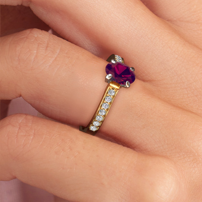 The ring shown above is called the Valorie ovl 2. We call this type of ring a pavé solitaire ring because it has one centre gemstone and a band that is also pave set with gemstones. This engagement ring is made in 14 Carat gold set with a 7x5 mm oval rhodolite, and pave set lab-grown diamonds at the sides. Each piece of jewellery is made with passion and love by one of our master goldsmiths.This fashionable gold pavé solitaire engagement ring has an exquisite oval rhodolite centre stone. To further accentuate the centre stone, the band is set full with more lab-grown diamonds. Its open prong setting allows light to strike the rhodolite from various angles and this adds sparkle to your rhodolite ring. The photo shown above depicts the goldsmith's carefully handcrafted details of the ring. The high positioning of the centre stone is truly eye-catching. The perfect engagement ring for the crown jewel of your life!Are you on a budget? Please feel free to contact us, so we can go discuss your options. We offer our engagement rings at guaranteed best price, because we make them to order. You won't find such a price anywhere else!Our team adds new designs to our online collection daily. Our designers and goldsmiths work together in creating the best design. We strive to offer a diverse collection of jewels. Perhaps you have a specific jewel design in mind. One you came across somewhere. Please contact us for a free consultation. We will make you an offer, based on a fair price/ quality ratio, that will baffle you.To make it easier for you, we offer a 30 day return policy. Check our terms and conditions.