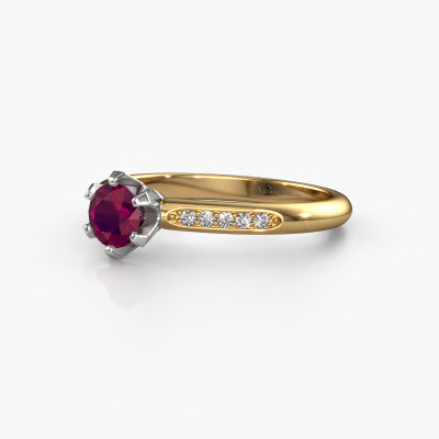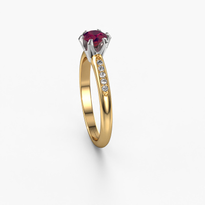 The ring shown above is called the Tiffy 2. We call this type of ring a pavé solitaire ring because it has one centre gemstone and a band that is also pave set with gemstones. This engagement ring is made in 14 Carat gold set with a 4.7 mm round rhodolite, and pave set diamonds at the sides. Each piece of jewellery is created to add sparkle to your finger, each jewel is lovingly made by hand by our goldsmiths.This traditional gold pavé solitaire engagement ring has an exquisite round rhodolite centre stone. To further accentuate the centre stone, the band is set full with more diamonds. Its open prong setting allows light to strike the rhodolite from various angles and this adds sparkle to your rhodolite ring. The photo shown above depicts the goldsmith's carefully handcrafted details of the ring. The high positioning of the centre stone is truly eye-catching. The perfect engagement ring for the crown jewel of your life!By using our modern techniques, we can design and customize the finest quality jewels with the utmost care for you. Our engagement rings are always priced 30 percent lower than other jewellers. We make engagement rings to order so we don't have to maintain a large stock. If you have a certain budget, we are more than happy to advice you accordingly.Our designers and goldsmiths work together each day, creating new jewels. Perhaps you have found a nice traditional engagement ring somewhere, which can be used to customize your unique ring. Please feel free to contact us. We will make you an offer, based on a fair price/ quality ratio, which will amaze you.To make it easier for you, we offer a 30 day return policy. Check our terms and conditions.