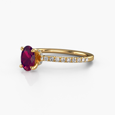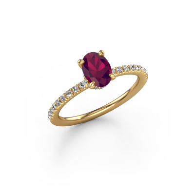 The ring shown above is called the Crystal OVL 4. We call this type of ring a pavé solitaire ring because it has one centre gemstone and a band that is also pave set with gemstones. The 14 Carat gold engagement ring is set with a oval 7x5 mm rhodolite centre stone and the band is pave set with diamond gemstones. Each jewel is made with passion and love by one of our master goldsmiths.This contemporary gold pavé solitaire engagement ring has an exquisite oval rhodolite centre stone. To further accentuate the centre stone, the band is fully set with more diamonds. Its open prong setting allows light to strike the rhodolite from various angles and this adds sparkle to your rhodolite ring. The photo shown above depicts the goldsmith's carefully handcrafted details of the ring. The high positioning of the centre stone is truly eye-catching. The perfect engagement ring for the crown jewel of your life! After receiving your order, our goldsmiths will passionately start the creative process of making your engagement ring in our own studio. Because we don't have a big stockpile, these costs will not be passed on to you. Our pricing is proof of that! We offer top quality jewels at lowest price, guaranteed.Our team adds new designs to our online collection daily. Our designers and goldsmiths work together in creating the best design. We strive to offer a diverse collection of jewels. Perhaps you have a specific jewel design in mind. One you came across somewhere. Please contact us for a free consultation. We will make you an offer, based on a fair price/ quality ratio, that will baffle you.To make it easier for you, we offer a 30 day return policy. Check our terms and conditions.