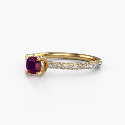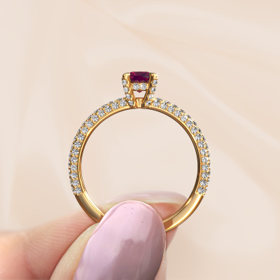The ring shown above is called the Saskia 2 cus. We call this type of ring a pavé solitaire ring because it has one centre gemstone and a band that is also pave set with gemstones. The 14 Carat gold engagement ring is set with a cushion 4.5 mm rhodolite centre stone and the band is pave set with lab grown diamond gemstones. Each jewel is made just for you, with attention to detail and design.This contemporary gold pavé solitaire engagement ring has an exquisite cushion rhodolite centre stone. To further accentuate the centre stone, the band is fully set with more lab-grown diamonds. Its open prong setting allows light to strike the rhodolite from various angles and this adds sparkle to your rhodolite ring. The photo shown above depicts the goldsmith's carefully handcrafted details of the ring. The high positioning of the centre stone is truly eye-catching. The perfect engagement ring for the crown jewel of your life! Are you on a budget? Please feel free to contact us, so we can go discuss your options. We offer our engagement rings at guaranteed best price, because we make them to order. You won't find such a price anywhere else!Our designers and goldsmiths work together each day, creating new jewels. Perhaps you have found a nice contemporary engagement ring somewhere, which can be used to customize your unique ring. Please feel free to contact us. We will make you an offer, based on a fair price/ quality ratio, which will amaze you.To make it easier for you, we offer a 30 day return policy. Check our terms and conditions.