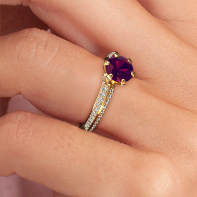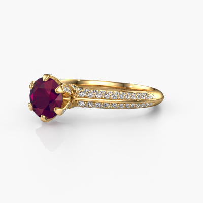 The ring shown above is called the Abby. We call this type of ring a pavé solitaire ring because it has one centre gemstone and a band that is also pave set with gemstones. The 14 Carat gold engagement ring is set with a round 6.5 mm rhodolite centre stone and the band is pave set with diamond gemstones. Each jewel is made just for you by our master goldsmiths in our own studio.This exclusive gold pavé solitaire engagement ring has an exquisite round rhodolite centre stone. To further accentuate the centre stone, the band is fully set with more diamonds. Its open prong setting allows light to strike the rhodolite from various angles and this adds sparkle to your rhodolite ring. The photo shown above depicts the goldsmith's carefully handcrafted details of the ring. The high positioning of the centre stone is truly eye-catching. The perfect engagement ring for the crown jewel of your life! Are you on a budget? Please feel free to contact us, so we can go discuss your options. We offer our engagement rings at guaranteed best price, because we make them to order. You won't find such a price anywhere else!Our team adds new designs to our online collection daily. Our designers and goldsmiths work together in creating the best design. We strive to offer a diverse collection of jewels. Perhaps you have a specific jewel design in mind. One you came across somewhere. Please contact us for a free consultation. We will make you an offer, based on a fair price/ quality ratio, that will baffle you.To make it easier for you, we offer a 30 day return policy. Check our terms and conditions.
