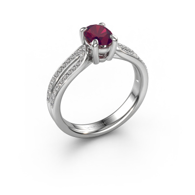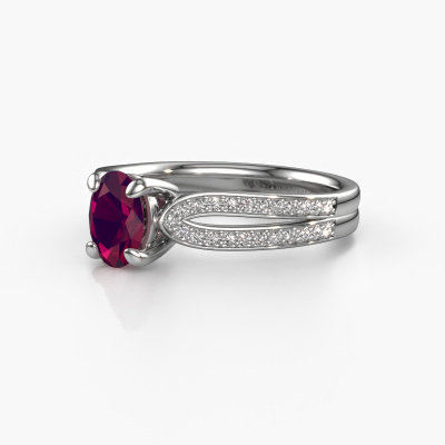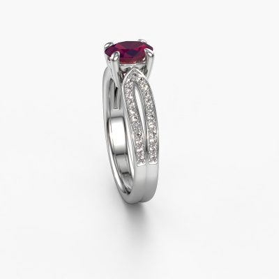 The ring shown above is called the Antonia ovl 2. We call this type of ring a pavé solitaire ring because it has one centre gemstone and a band that is also pave set with gemstones. The platinum engagement ring is set with a oval 7x5 mm rhodolite centre stone and the band is pave set with diamond gemstones. Each jewel is unique in every way! Simply customize to your liking,This contemporary platinum pavé solitaire engagement ring has an exquisite oval rhodolite centre stone. To further accentuate the centre stone, the band is fully set with more diamonds. Its open prong setting allows light to strike the rhodolite from various angles and this adds sparkle to your rhodolite ring. The photo shown above depicts the goldsmith's carefully handcrafted details of the ring. The high positioning of the centre stone is truly eye-catching. The perfect engagement ring for the crown jewel of your life! By using a combination of the latest modern techniques, combined with ancient crafting, we can make all our engagement rings in our own studio. Each jewel is made to order. This is advantageous because we can offer you a price you won't find anywhere else.Our team adds new designs to our online collection daily. Our designers and goldsmiths work together in creating the best design. We strive to offer a diverse collection of jewels. Perhaps you have a specific jewel design in mind. One you came across somewhere. Please contact us for a free consultation. We will make you an offer, based on a fair price/ quality ratio, that will baffle you.To make it easier for you, we offer a 30 day return policy. Check our terms and conditions.