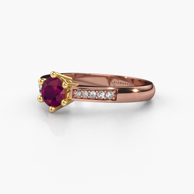 The ring shown above is called the Luna 2. We call this type of ring a pavé solitaire ring because it has one centre gemstone and a band that is also pave set with gemstones. This engagement ring is made in 14 Carat rose gold set with a 5 mm round rhodolite, and pave set diamonds at the sides. Each piece of jewellery is unique in every way! Simply customize to your liking,This classic rose gold pavé solitaire engagement ring has an exquisite round rhodolite centre stone. To further accentuate the centre stone, the band is set full with more diamonds. Its open prong setting allows light to strike the rhodolite from various angles and this adds sparkle to your rhodolite ring. The photo shown above depicts the goldsmith's carefully handcrafted details of the ring. The high positioning of the centre stone is truly eye-catching. The perfect engagement ring for the crown jewel of your life!Because we design and deliver our own rings, we can offer you a engagement ring at a price you won't find anywhere else. A ring is made to order, which helps prevent excess supplies, so we can make you a great price offer. We understand it feels risky, buying your engagement ring online, but we will gladly assist in the designing process, taking your budget into consideration.Our team adds new designs to our online collection daily. Our designers and goldsmiths work together in creating the best design. We strive to offer a diverse collection of jewels. Perhaps you have a specific jewel design in mind. One you came across somewhere. Please contact us for a free consultation. We will make you an offer, based on a fair price/ quality ratio, that will baffle you.To make it easier for you, we offer a 30 day return policy. Check our terms and conditions.