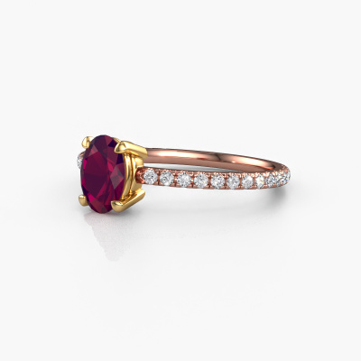 The ring shown above is called the Lynelle 2. We call this type of ring a pavé solitaire ring because it has one centre gemstone and a band that is also pave set with gemstones. This engagement ring is made in 14 Carat rose gold set with a 7x5 mm oval rhodolite, and pave set diamonds at the sides. Each piece of jewellery is created to add sparkle to your finger, each jewel is lovingly made by hand by our goldsmiths.This classic rose gold pavé solitaire engagement ring has an exquisite oval rhodolite centre stone. To further accentuate the centre stone, the band is set full with more diamonds. Its open prong setting allows light to strike the rhodolite from various angles and this adds sparkle to your rhodolite ring. The photo shown above depicts the goldsmith's carefully handcrafted details of the ring. The high positioning of the centre stone is truly eye-catching. The perfect engagement ring for the crown jewel of your life!After receiving your order, our goldsmiths will start the creative process of making your Lynelle 2 engagement ring. We don't keep stock. This is advantageous because these costs will not be passed on to you. Therefore, we can offer jewellery at exceptionally low prices.Do you have a specific ring in mind? One you came across somewhere. Please feel free to tell us your wishes and we will turn your design into a unique engagement ring. You can follow the development of your ring design because we use 3D drawings. This gives you a realistic preview of your design. We will gladly send you a non-binding offer, based on a fair price/ quality ratio. It will amaze you.To make it easier for you, we offer a 30 day return policy. Check our terms and conditions.