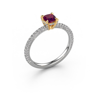 The ring shown above is called the Saskia 2 cus. We call this type of ring a pavé solitaire ring because it has one centre gemstone and a band that is also pave set with gemstones. The 14 Carat white gold engagement ring is set with a cushion 4.5 mm rhodolite centre stone and the band is pave set with lab grown diamond gemstones. Each jewel is made just for you, with attention to detail and design.This contemporary white gold pavé solitaire engagement ring has an exquisite cushion rhodolite centre stone. To further accentuate the centre stone, the band is fully set with more lab-grown diamonds. Its open prong setting allows light to strike the rhodolite from various angles and this adds sparkle to your rhodolite ring. The photo shown above depicts the goldsmith's carefully handcrafted details of the ring. The high positioning of the centre stone is truly eye-catching. The perfect engagement ring for the crown jewel of your life! Are you on a budget? Please feel free to contact us, so we can go discuss your options. We offer our engagement rings at guaranteed best price, because we make them to order. You won't find such a price anywhere else!Our designers and goldsmiths work together each day, creating new jewels. Perhaps you have found a nice contemporary engagement ring somewhere, which can be used to customize your unique ring. Please feel free to contact us. We will make you an offer, based on a fair price/ quality ratio, which will amaze you.To make it easier for you, we offer a 30 day return policy. Check our terms and conditions.