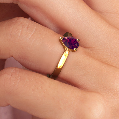 The ring shown above is called the Mignon per 1, we call this a solitaire ring because it contains a single gemstone. The engagement ring is made in 14 Carat gold and has a pear rhodolite of 7x5 mm. The cool thing about our configurator is that you can compile your own piece of jewellery, into a completely personalized one. This solitaire ring is crafted in the precious metals gold with gold, but of course you are free to pick your own colours. Each piece of jewellery is created to add sparkle to your finger, each jewel is lovingly made by hand by our goldsmiths.The solitaire ring is a special type of engagement ring. Its open prong setting allows light to strike the gemstone from various angles. This classic engagement ring is a stunning eye-catcher because of the high positioning of the gemstone. In order for you to commemorate your proposal with a unique ring, we carefully adorn this solitaire ring by hand. The love of your life deserves nothing but the best. After receiving your order, our goldsmiths will start the creative process of making your Mignon per 1 engagement ring. We don't keep stock. This is advantageous because these costs will not be passed on to you. Therefore, we can offer jewellery at exceptionally low prices.Our team adds new designs to our online collection daily. Our designers and goldsmiths work together in creating the best design. We strive to offer a diverse collection of jewels. Perhaps you have a specific jewel design in mind. One you came across somewhere. Please contact us for a free consultation. We will make you an offer, based on a fair price/ quality ratio, that will baffle you.To make it easier for you, we offer a 30 day return policy. Check our terms and conditions.