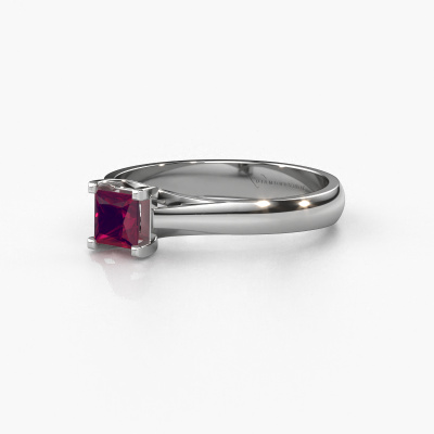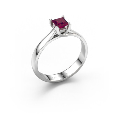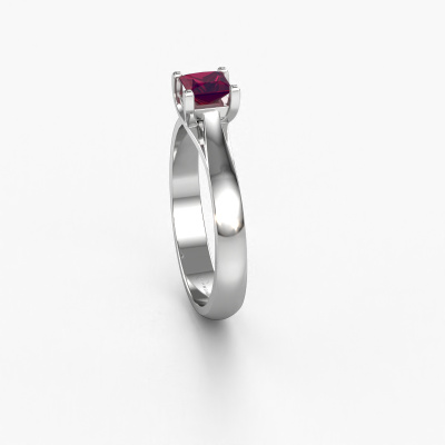 The ring shown above is called the Mia Square, we call this a solitaire ring because it contains a single gemstone. The engagement ring is made in platinum and has a princess rhodolite of 4 mm. The cool thing about our configurator is that you can compile your own piece of jewellery, into a completely personalized one. This solitaire ring is crafted in the precious metals platinum with platinum, but of course you are free to pick your own colours. Each piece of jewellery is made by a team of passionate goldsmiths and jewel designers. This will make your crown jewel truly eye-catching.The solitaire ring is a special type of engagement ring. Its open prong setting allows light to strike the gemstone from various angles. This modern engagement ring is a stunning eye-catcher because of the high positioning of the gemstone. In order for you to commemorate your proposal with a unique ring, we carefully adorn this solitaire ring by hand. The love of your life deserves nothing but the best. By using our modern techniques, we can design and customize the finest quality jewels with the utmost care for you. Our engagement rings are always priced 30 percent lower than other jewellers. We make engagement rings to order so we don't have to maintain a large stock. If you have a certain budget, we are more than happy to advice you accordingly.Have you found a specific engagement ring somewhere which you would like to give to your loved one? Please feel free to express your wishes to our jewel designers because we would be honoured to turn your design into a modern engagement ring. You can follow the development of your ring design because we use 3D drawings. This gives you a realistic preview of how your design will look. You can also preorder a dummy. A dummy is a plastic ring, which can be shaped according your ring design. You can try it on and check if its width and size are suitable for you. We will gladly send you a non-binding offer, based on a fair price/ quality ratio. It will amaze you, considering the quality of the ring and gemstones.To make it easier for you, we offer a 30 day return policy. Check our terms and conditions.