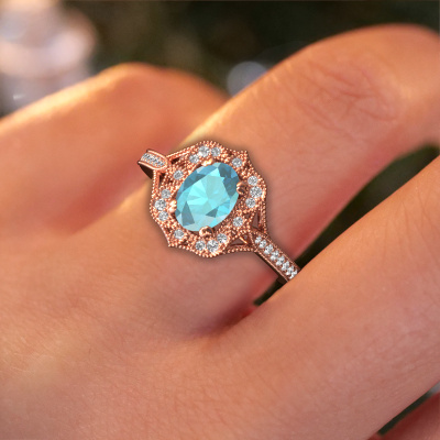 This 14 Carat rose gold ring is called Loni and is set with 7,5x5,5 mm blue topaz. This filigree rose gold engagement ring is a true work of art! A beautifully adorned design of intricate wires. With dedication, patience and the utmost precision, our expert goldsmith will design a ring just for you. The adornment of small wiring is crafted to perfection by hand. It's a lengthy process which includes welding, crafting and polishing until our Goldsmiths are completely satisfied with the result: a perfect eye-catching ring that makes her shine with delight. Therefore the vintage filigree engagement ring is an extraordinary gift to bestow upon the love of your life. A handmade one-of-a-kind personalized ring, to be given to that special someone on that special moment when you pop the question. Isn't that wonderful? This piece of jewellery is made with passion and love by one of our master goldsmiths.Because we design and deliver our own rings, we can offer you a engagement ring at a price you won't find anywhere else. A ring is made to order, which helps prevent excess supplies, so we can make you a great price offer. We understand it feels risky, buying your engagement ring online, but we will gladly assist in the designing process, taking your budget into consideration.Our team adds new designs to our online collection daily. Our designers and goldsmiths work together in creating the best design. We strive to offer a diverse collection of jewels. Perhaps you have a specific jewel design in mind. One you came across somewhere. Please contact us for a free consultation. We will make you an offer, based on a fair price/ quality ratio, that will baffle you.To make it easier for you, we offer a 30 day return policy. Check our terms and conditions.