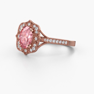 This 14 Carat rose gold ring is called Loni and is set with 7,5x5,5 mm pink lab grown diamond. This filigree rose gold engagement ring is a true work of art! A beautifully adorned design of intricate wires. With dedication, patience and the utmost precision, our expert goldsmith will design a ring just for you. The adornment of small wiring is crafted to perfection by hand. It's a lengthy process which includes welding, crafting and polishing until our Goldsmiths are completely satisfied with the result: a perfect eye-catching ring that makes her shine with delight. Therefore the vintage filigree engagement ring is an extraordinary gift to bestow upon the love of your life. A handmade one-of-a-kind personalized ring, to be given to that special someone on that special moment when you pop the question. Isn't that wonderful? This piece of jewellery is made with passion and love by one of our master goldsmiths.Because we design and deliver our own rings, we can offer you a engagement ring at a price you won't find anywhere else. A ring is made to order, which helps prevent excess supplies, so we can make you a great price offer. We understand it feels risky, buying your engagement ring online, but we will gladly assist in the designing process, taking your budget into consideration.Our team adds new designs to our online collection daily. Our designers and goldsmiths work together in creating the best design. We strive to offer a diverse collection of jewels. Perhaps you have a specific jewel design in mind. One you came across somewhere. Please contact us for a free consultation. We will make you an offer, based on a fair price/ quality ratio, that will baffle you.To make it easier for you, we offer a 30 day return policy. Check our terms and conditions.