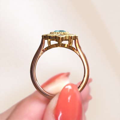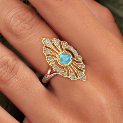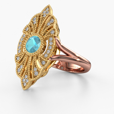 This 14 Carat rose gold ring is called Hanna and is set with 5 mm blue topaz. This filigree rose gold engagement ring is a true work of art! A beautifully adorned design of intricate wires. With dedication, patience and the utmost precision, our expert goldsmith will design a ring just for you. The adornment of small wiring is crafted to perfection by hand. It's a lengthy process which includes welding, crafting and polishing until our Goldsmiths are completely satisfied with the result: a perfect eye-catching ring that makes her shine with delight. Therefore the vintage filigree engagement ring is an extraordinary gift to bestow upon the love of your life. A handmade one-of-a-kind personalized ring, to be given to that special someone on that special moment when you pop the question. Isn't that wonderful? This piece of jewellery is created to add sparkle to your finger, each jewel is lovingly made by hand by our goldsmiths.After receiving your order, our goldsmiths will passionately start the creative process of making your engagement ring in our own studio. Because we don't have a big stockpile, these costs will not be passed on to you. Our pricing is proof of that! We offer top quality jewels at lowest price, guaranteed.Our team adds new designs to our online collection daily. Our designers and goldsmiths work together in creating the best design. We strive to offer a diverse collection of jewels. Perhaps you have a specific jewel design in mind. One you came across somewhere. Please contact us for a free consultation. We will make you an offer, based on a fair price/ quality ratio, that will baffle you.To make it easier for you, we offer a 30 day return policy. Check our terms and conditions.