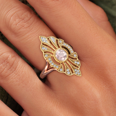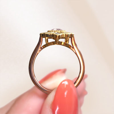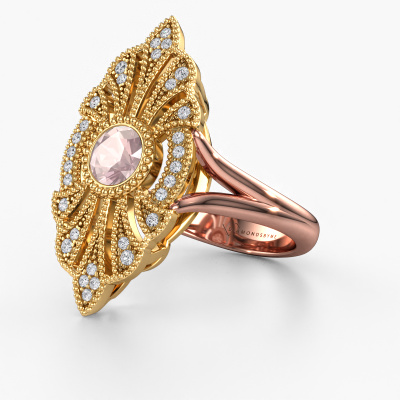 This 14 Carat rose gold ring is called Hanna and is set with 5 mm morganite champagne. This filigree rose gold engagement ring is a true work of art! A beautifully adorned design of intricate wires. With dedication, patience and the utmost precision, our expert goldsmith will design a ring just for you. The adornment of small wiring is crafted to perfection by hand. It's a lengthy process which includes welding, crafting and polishing until our Goldsmiths are completely satisfied with the result: a perfect eye-catching ring that makes her shine with delight. Therefore the vintage filigree engagement ring is an extraordinary gift to bestow upon the love of your life. A handmade one-of-a-kind personalized ring, to be given to that special someone on that special moment when you pop the question. Isn't that wonderful? This piece of jewellery is created to add sparkle to your finger, each jewel is lovingly made by hand by our goldsmiths.After receiving your order, our goldsmiths will passionately start the creative process of making your engagement ring in our own studio. Because we don't have a big stockpile, these costs will not be passed on to you. Our pricing is proof of that! We offer top quality jewels at lowest price, guaranteed.Our team adds new designs to our online collection daily. Our designers and goldsmiths work together in creating the best design. We strive to offer a diverse collection of jewels. Perhaps you have a specific jewel design in mind. One you came across somewhere. Please contact us for a free consultation. We will make you an offer, based on a fair price/ quality ratio, that will baffle you.To make it easier for you, we offer a 30 day return policy. Check our terms and conditions.