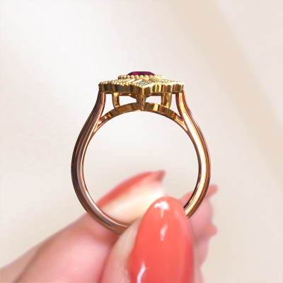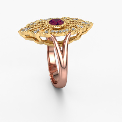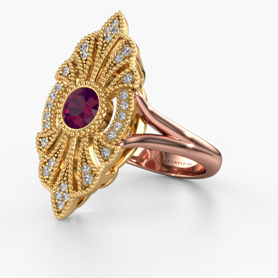 This 14 Carat rose gold ring is called Hanna and is set with 5 mm rhodolite. This filigree rose gold engagement ring is a true work of art! A beautifully adorned design of intricate wires. With dedication, patience and the utmost precision, our expert goldsmith will design a ring just for you. The adornment of small wiring is crafted to perfection by hand. It's a lengthy process which includes welding, crafting and polishing until our Goldsmiths are completely satisfied with the result: a perfect eye-catching ring that makes her shine with delight. Therefore the vintage filigree engagement ring is an extraordinary gift to bestow upon the love of your life. A handmade one-of-a-kind personalized ring, to be given to that special someone on that special moment when you pop the question. Isn't that wonderful? This piece of jewellery is created to add sparkle to your finger, each jewel is lovingly made by hand by our goldsmiths.After receiving your order, our goldsmiths will passionately start the creative process of making your engagement ring in our own studio. Because we don't have a big stockpile, these costs will not be passed on to you. Our pricing is proof of that! We offer top quality jewels at lowest price, guaranteed.Our team adds new designs to our online collection daily. Our designers and goldsmiths work together in creating the best design. We strive to offer a diverse collection of jewels. Perhaps you have a specific jewel design in mind. One you came across somewhere. Please contact us for a free consultation. We will make you an offer, based on a fair price/ quality ratio, that will baffle you.To make it easier for you, we offer a 30 day return policy. Check our terms and conditions.