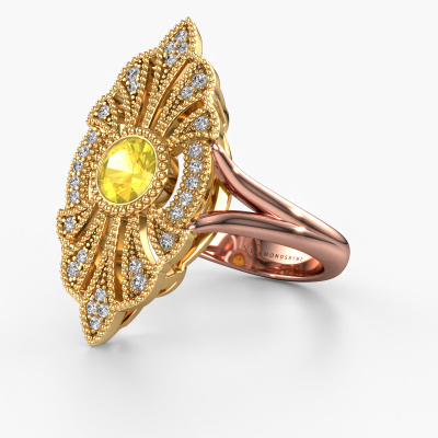 This 14 Carat rose gold ring is called Hanna and is set with 5 mm yellow sapphire. This filigree rose gold engagement ring is a true work of art! A beautifully adorned design of intricate wires. With dedication, patience and the utmost precision, our expert goldsmith will design a ring just for you. The adornment of small wiring is crafted to perfection by hand. It's a lengthy process which includes welding, crafting and polishing until our Goldsmiths are completely satisfied with the result: a perfect eye-catching ring that makes her shine with delight. Therefore the vintage filigree engagement ring is an extraordinary gift to bestow upon the love of your life. A handmade one-of-a-kind personalized ring, to be given to that special someone on that special moment when you pop the question. Isn't that wonderful? This piece of jewellery is created to add sparkle to your finger, each jewel is lovingly made by hand by our goldsmiths.After receiving your order, our goldsmiths will passionately start the creative process of making your engagement ring in our own studio. Because we don't have a big stockpile, these costs will not be passed on to you. Our pricing is proof of that! We offer top quality jewels at lowest price, guaranteed.Our team adds new designs to our online collection daily. Our designers and goldsmiths work together in creating the best design. We strive to offer a diverse collection of jewels. Perhaps you have a specific jewel design in mind. One you came across somewhere. Please contact us for a free consultation. We will make you an offer, based on a fair price/ quality ratio, that will baffle you.To make it easier for you, we offer a 30 day return policy. Check our terms and conditions.