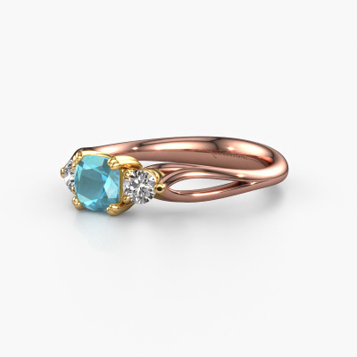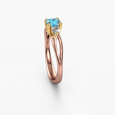 This 14 Carat rose gold ring is called Amie cus and is set with 5 mm blue topaz. Does your girlfriend fancy exclusive jewellery? Or would you like to show her that she deserves the finest jewellery? This rose gold ring is pure craftsmanship, love and passion combined with the latest techniques coming together in perfect harmony. It requires a keen eye, patience and a skilful hand to mould this ring into perfection. Just the job for our expert goldsmith! The blue topaz set gemstones gives this rose gold ring an extra glamorous appearance. Customize the style of the ajour engagement ring to her liking with a wide variety of precious metals and gemstones which you select. That is how you create a unique ring for the most exclusive woman in your life! This jewel is made just for you, with attention to detail and design.After receiving your order, our goldsmiths will passionately start the creative process of making your engagement ring in our own studio. Because we don't have a big stockpile, these costs will not be passed on to you. Our pricing is proof of that! We offer top quality jewels at lowest price, guaranteed.Have you found a specific engagement ring somewhere which you would like to give to your loved one? Please feel free to express your wishes to our jewel designers because we would be honoured to turn your design into a fantasy engagement ring. You can follow the development of your ring design because we use 3D drawings. This gives you a realistic preview of how your design will look. You can also preorder a dummy. A dummy is a plastic ring, which can be shaped according your ring design. You can try it on and check if its width and size are suitable for you. We will gladly send you a non-binding offer, based on a fair price/ quality ratio. It will amaze you, considering the quality of the ring and gemstones.To make it easier for you, we offer a 30 day return policy. Check our terms and conditions.