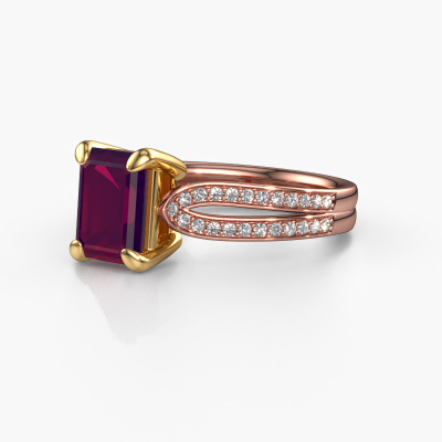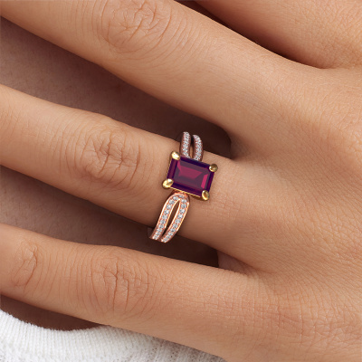 This 14 Carat rose gold ring is called Antonia eme 2 and is set with 8x6 mm rhodolite. Does your girlfriend fancy exclusive jewellery? Or would you like to show her that she deserves the finest jewellery? This rose gold ring is pure craftsmanship, love and passion combined with the latest techniques coming together in perfect harmony. It requires a keen eye, patience and a skilful hand to mould this ring into perfection. Just the job for our expert goldsmith! The rhodolite set gemstones gives this rose gold ring an extra glamorous appearance. Customize the style of the split band engagement ring to her liking with a wide variety of precious metals and gemstones which you select. That is how you create a unique ring for the most exclusive woman in your life! This jewel is made to shine bright around your finger. Each jewel is hand made with love by our goldsmiths.After receiving your order, our goldsmiths will start the creative process of making your Antonia eme 2 engagement ring. We don't keep stock. This is advantageous because these costs will not be passed on to you. Therefore, we can offer jewellery at exceptionally low prices.Do you have a specific ring in mind? One you came across somewhere. Please feel free to tell us your wishes and we will turn your design into a unique engagement ring. You can follow the development of your ring design because we use 3D drawings. This gives you a realistic preview of your design. We will gladly send you a non-binding offer, based on a fair price/ quality ratio. It will amaze you.To make it easier for you, we offer a 30 day return policy. Check our terms and conditions.