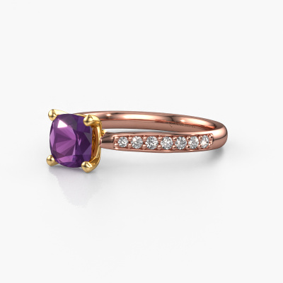 The ring shown above is called the Mignon cus 2. We call this type of ring a pavé solitaire ring because it has one centre gemstone and a band that is also pave set with gemstones. The 14 Carat rose gold engagement ring is set with a cushion 6 mm amethyst centre stone and the band is pave set with lab grown diamond gemstones. Each jewel is made with passion and love by one of our master goldsmiths.This exclusive rose gold pavé solitaire engagement ring has an exquisite cushion amethyst centre stone. To further accentuate the centre stone, the band is fully set with more lab-grown diamonds. Its open prong setting allows light to strike the amethyst from various angles and this adds sparkle to your amethyst ring. The photo shown above depicts the goldsmith's carefully handcrafted details of the ring. The high positioning of the centre stone is truly eye-catching. The perfect engagement ring for the crown jewel of your life! After receiving your order, our goldsmiths will start the creative process of making your Mignon cus 2 engagement ring. We don't keep stock. This is advantageous because these costs will not be passed on to you. Therefore, we can offer jewellery at exceptionally low prices.Our team adds new designs to our online collection daily. Our designers and goldsmiths work together in creating the best design. We strive to offer a diverse collection of jewels. Perhaps you have a specific jewel design in mind. One you came across somewhere. Please contact us for a free consultation. We will make you an offer, based on a fair price/ quality ratio, that will baffle you.To make it easier for you, we offer a 30 day return policy. Check our terms and conditions.