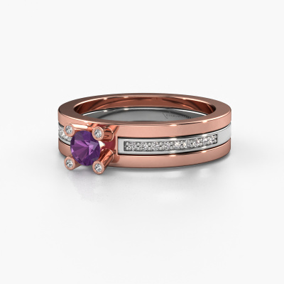 The ring shown above is called the Alisha. We call this type of ring a pavé solitaire ring because it has one centre gemstone and a band that is also pave set with gemstones. The 14 Carat rose gold engagement ring is set with a round 4 mm amethyst centre stone and the band is pave set with diamond gemstones. Each jewel is unique in every way! Simply customize to your liking,This design rose gold pavé solitaire engagement ring has an exquisite round amethyst centre stone. To further accentuate the centre stone, the band is fully set with more diamonds. Its open prong setting allows light to strike the amethyst from various angles and this adds sparkle to your amethyst ring. The photo shown above depicts the goldsmith's carefully handcrafted details of the ring. The high positioning of the centre stone is truly eye-catching. The perfect engagement ring for the crown jewel of your life! By using a combination of the latest modern techniques, combined with ancient crafting, we can make all our engagement rings in our own studio. Each jewel is made to order. This is advantageous because we can offer you a price you won't find anywhere else.Have you found a specific engagement ring somewhere which you would like to give to your loved one? Please feel free to express your wishes to our jewel designers because we would be honoured to turn your design into a design engagement ring. You can follow the development of your ring design because we use 3D drawings. This gives you a realistic preview of how your design will look. You can also preorder a dummy. A dummy is a plastic ring, which can be shaped according your ring design. You can try it on and check if its width and size are suitable for you. We will gladly send you a non-binding offer, based on a fair price/ quality ratio. It will amaze you, considering the quality of the ring and gemstones.To make it easier for you, we offer a 30 day return policy. Check our terms and conditions.