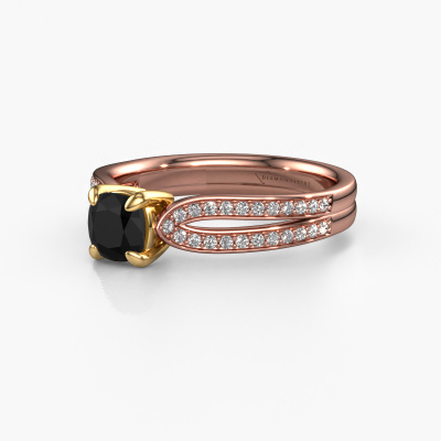 The ring shown above is called the Antonia cus 2. We call this type of ring a pavé solitaire ring because it has one centre gemstone and a band that is also pave set with gemstones. The 14 Carat rose gold engagement ring is set with a cushion 0.70 crt black diamond centre stone and the band is pave set with lab grown diamond gemstones. Each jewel is made just for you by our master goldsmiths in our own studio.This fantasy rose gold pavé solitaire engagement ring has an exquisite cushion black diamond centre stone. To further accentuate the centre stone, the band is fully set with more lab-grown diamonds. Its open prong setting allows light to strike the black diamond from various angles and this adds sparkle to your black diamond ring. The photo shown above depicts the goldsmith's carefully handcrafted details of the ring. The high positioning of the centre stone is truly eye-catching. The perfect engagement ring for the crown jewel of your life! By using our modern techniques, we can design and customize the finest quality jewels with the utmost care for you. Our engagement rings are always priced 30 percent lower than other jewellers. We make engagement rings to order so we don't have to maintain a large stock. If you have a certain budget, we are more than happy to advice you accordingly.Have you found a specific engagement ring somewhere which you would like to give to your loved one? Please feel free to express your wishes to our jewel designers because we would be honoured to turn your design into a fantasy engagement ring. You can follow the development of your ring design because we use 3D drawings. This gives you a realistic preview of how your design will look. You can also preorder a dummy. A dummy is a plastic ring, which can be shaped according your ring design. You can try it on and check if its width and size are suitable for you. We will gladly send you a non-binding offer, based on a fair price/ quality ratio. It will amaze you, considering the quality of the ring and gemstones.To make it easier for you, we offer a 30 day return policy. Check our terms and conditions.