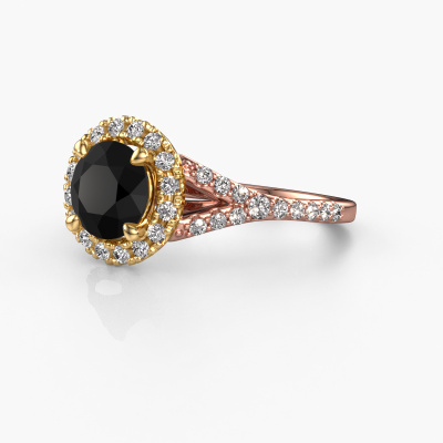 The ring shown above is called the Kimber RND. We call this type of ring a pavé solitaire ring because it has one centre gemstone and a band that is also pave set with gemstones. The 14 Carat rose gold engagement ring is set with a round 1.80 crt black diamond centre stone and the band is pave set with lab grown diamond gemstones. Each jewel is created to add sparkle to your finger, each jewel is lovingly made by hand by our goldsmiths.This classic rose gold pavé solitaire engagement ring has an exquisite round black diamond centre stone. To further accentuate the centre stone, the band is fully set with more lab-grown diamonds. Its open prong setting allows light to strike the black diamond from various angles and this adds sparkle to your black diamond ring. The photo shown above depicts the goldsmith's carefully handcrafted details of the ring. The high positioning of the centre stone is truly eye-catching. The perfect engagement ring for the crown jewel of your life! After receiving your order, our goldsmiths will passionately start the creative process of making your engagement ring in our own studio. Because we don't have a big stockpile, these costs will not be passed on to you. Our pricing is proof of that! We offer top quality jewels at lowest price, guaranteed.Our team adds new designs to our online collection daily. Our designers and goldsmiths work together in creating the best design. We strive to offer a diverse collection of jewels. Perhaps you have a specific jewel design in mind. One you came across somewhere. Please contact us for a free consultation. We will make you an offer, based on a fair price/ quality ratio, that will baffle you.To make it easier for you, we offer a 30 day return policy. Check our terms and conditions.