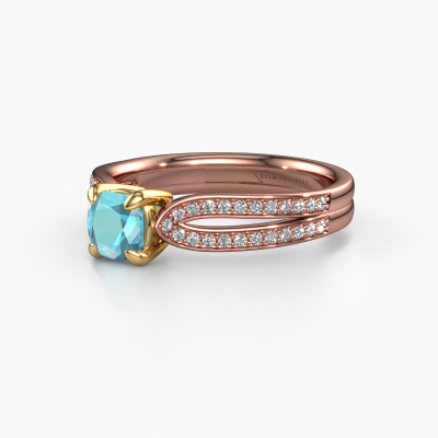 The ring shown above is called the Antonia cus 2. We call this type of ring a pavé solitaire ring because it has one centre gemstone and a band that is also pave set with gemstones. The 14 Carat rose gold engagement ring is set with a cushion 5 mm blue topaz centre stone and the band is pave set with lab grown diamond gemstones. Each jewel is made just for you by our master goldsmiths in our own studio.This fantasy rose gold pavé solitaire engagement ring has an exquisite cushion blue topaz centre stone. To further accentuate the centre stone, the band is fully set with more lab-grown diamonds. Its open prong setting allows light to strike the blue topaz from various angles and this adds sparkle to your blue topaz ring. The photo shown above depicts the goldsmith's carefully handcrafted details of the ring. The high positioning of the centre stone is truly eye-catching. The perfect engagement ring for the crown jewel of your life! By using our modern techniques, we can design and customize the finest quality jewels with the utmost care for you. Our engagement rings are always priced 30 percent lower than other jewellers. We make engagement rings to order so we don't have to maintain a large stock. If you have a certain budget, we are more than happy to advice you accordingly.Have you found a specific engagement ring somewhere which you would like to give to your loved one? Please feel free to express your wishes to our jewel designers because we would be honoured to turn your design into a fantasy engagement ring. You can follow the development of your ring design because we use 3D drawings. This gives you a realistic preview of how your design will look. You can also preorder a dummy. A dummy is a plastic ring, which can be shaped according your ring design. You can try it on and check if its width and size are suitable for you. We will gladly send you a non-binding offer, based on a fair price/ quality ratio. It will amaze you, considering the quality of the ring and gemstones.To make it easier for you, we offer a 30 day return policy. Check our terms and conditions.