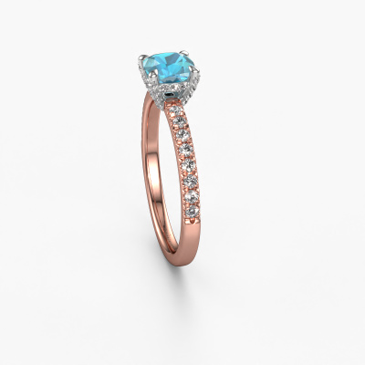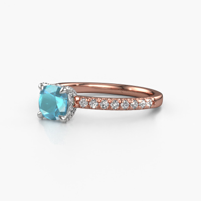 The ring shown above is called the Saskia 1 cus. We call this type of ring a pavé solitaire ring because it has one centre gemstone and a band that is also pave set with gemstones. The 14 Carat rose gold engagement ring is set with a cushion 5.5 mm blue topaz centre stone and the band is pave set with diamond gemstones. Each jewel is made by a team of passionate goldsmiths and jewel designers. This will make your crown jewel truly eye-catching.This unique rose gold pavé solitaire engagement ring has an exquisite cushion blue topaz centre stone. To further accentuate the centre stone, the band is fully set with more diamonds. Its open prong setting allows light to strike the blue topaz from various angles and this adds sparkle to your blue topaz ring. The photo shown above depicts the goldsmith's carefully handcrafted details of the ring. The high positioning of the centre stone is truly eye-catching. The perfect engagement ring for the crown jewel of your life! By using a combination of the latest modern techniques, combined with ancient crafting, we can make all our engagement rings in our own studio. Each jewel is made to order. This is advantageous because we can offer you a price you won't find anywhere else.Our team adds new designs to our online collection daily. Our designers and goldsmiths work together in creating the best design. We strive to offer a diverse collection of jewels. Perhaps you have a specific jewel design in mind. One you came across somewhere. Please contact us for a free consultation. We will make you an offer, based on a fair price/ quality ratio, that will baffle you.To make it easier for you, we offer a 30 day return policy. Check our terms and conditions.