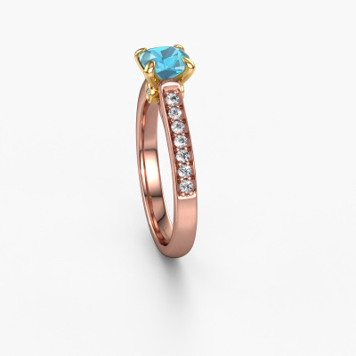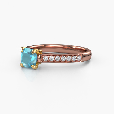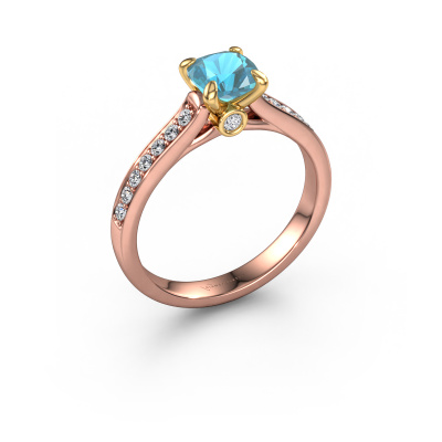 The ring shown above is called the Valorie cus 2. We call this type of ring a pavé solitaire ring because it has one centre gemstone and a band that is also pave set with gemstones. The 14 Carat rose gold engagement ring is set with a cushion 5.5 mm blue topaz centre stone and the band is pave set with diamond gemstones. Each jewel is made just for you by our master goldsmiths in our own studio.This traditional rose gold pavé solitaire engagement ring has an exquisite cushion blue topaz centre stone. To further accentuate the centre stone, the band is fully set with more diamonds. Its open prong setting allows light to strike the blue topaz from various angles and this adds sparkle to your blue topaz ring. The photo shown above depicts the goldsmith's carefully handcrafted details of the ring. The high positioning of the centre stone is truly eye-catching. The perfect engagement ring for the crown jewel of your life! By using a combination of the latest modern techniques, combined with ancient crafting, we can make all our engagement rings in our own studio. Each jewel is made to order. This is advantageous because we can offer you a price you won't find anywhere else.Our designers and goldsmiths work together each day, creating new jewels. Perhaps you have found a nice traditional engagement ring somewhere, which can be used to customize your unique ring. Please feel free to contact us. We will make you an offer, based on a fair price/ quality ratio, which will amaze you.To make it easier for you, we offer a 30 day return policy. Check our terms and conditions.